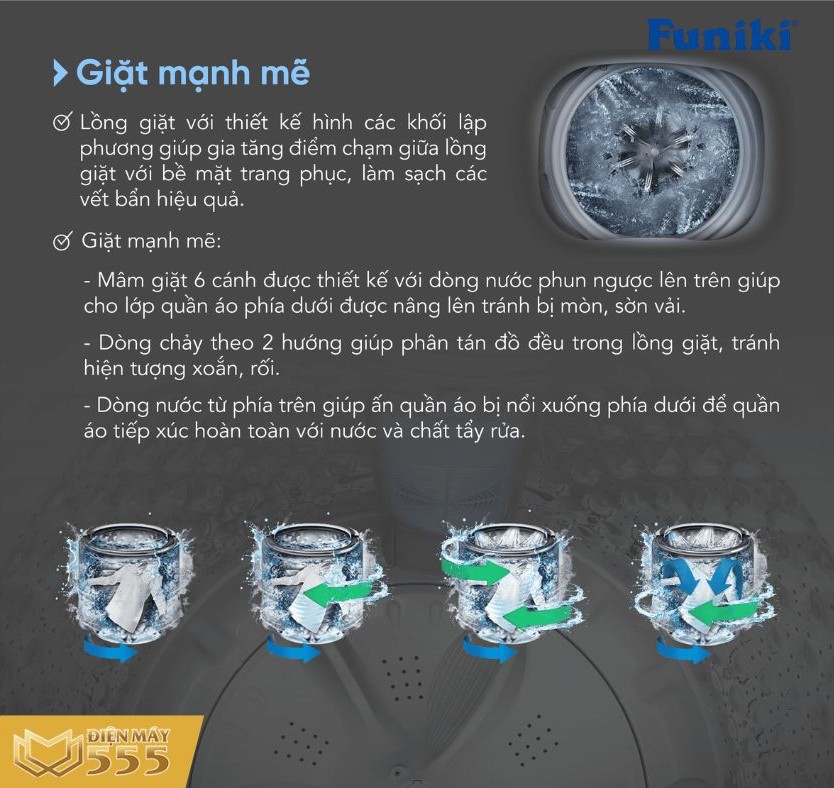 Được thiết kế với mâm giặt 6 cánh kết hợp cùng 3 luồng nước tuần hoàn mạnh mẽ bên trong lồng giặt, giúp tăng hiệu quả giặt sạch đến 15% so với các dòng máy giặt thông thường. Nhờ công nghệ này các vết bẩn cứng đầu trên quần áo được loại bỏ dễ dàng mà không làm xoắn rối hay gây hư hại vải.
