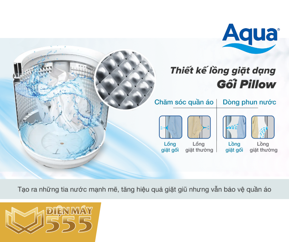 • - Lồng giặt dạng Pillow được hoàn thiện từ chất liệu thép không gỉ, có thiết kế đặc biệt với bề mặt hình gối và lỗ rất nhỏ chỉ 2.5 mm giúp cho việc giặt quần áo dễ dàng, bảo vệ quần áo tránh hiện tượng xơ vải mắc vào lỗ thoát nước.