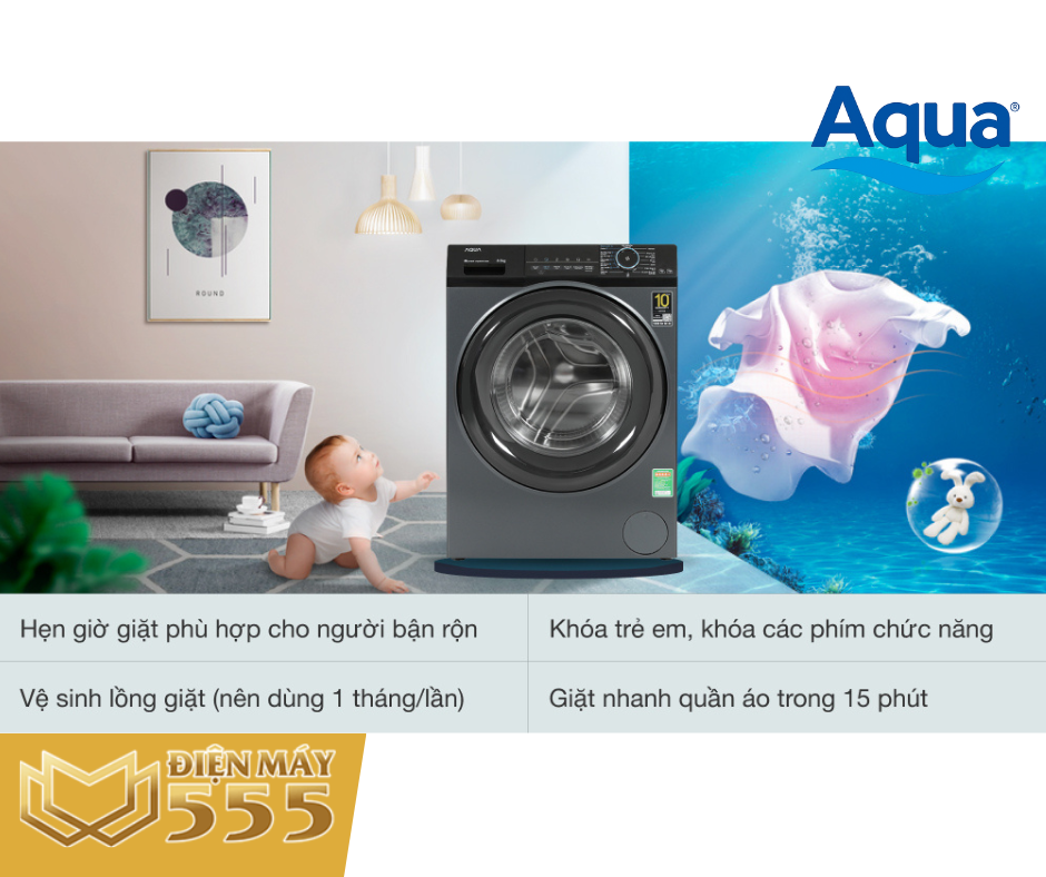 Máy giặt Aqua Inverter được tích hợp đa dạng chương trình: giặt AI, đồ cotton, đồ jeans, đồ trẻ em, giặt nhanh 15 phút, giặt nhẹ, vệ sinh lồng giặt… Nhờ sự đa dạng này, người dùng dễ dàng chọn chương trình phù hợp cho từng tình huống, từ giặt nhanh hằng ngày đến giặt chuyên biệt cho vải hoặc nhu cầu diệt khuẩn.