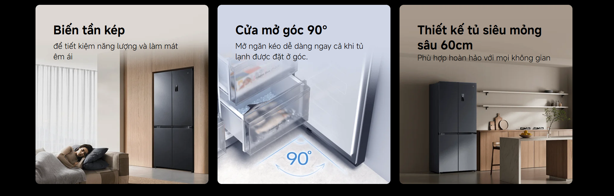 Tủ lạnh được trang bị công nghệ biến tần kép (dual inverter) bao gồm quạt và máy nén biến tần. Công nghệ này giúp tiết kiệm điện năng tối ưu, đồng thời giảm độ ồn khi vận hành – một yếu tố rất quan trọng đối với không gian sinh hoạt mở như bếp và phòng khách liền kề.