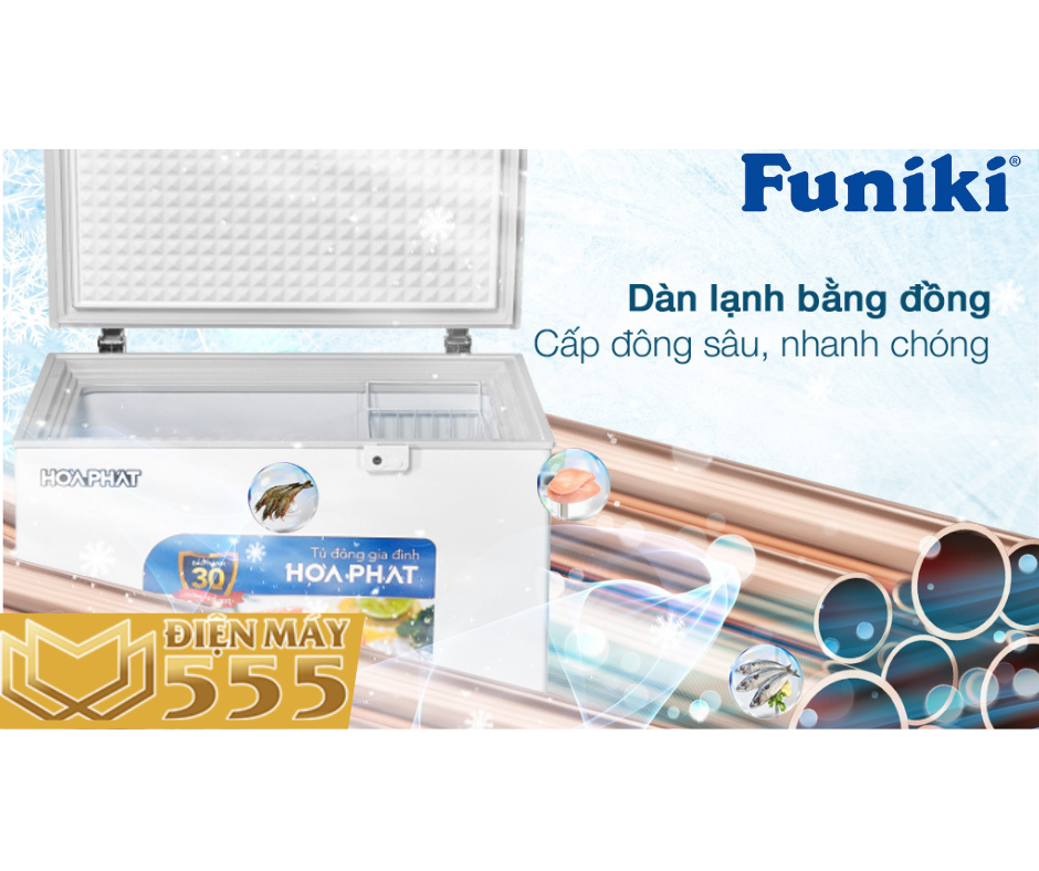 - Dàn lạnh tủ đông Hoà Phát bằng đồng nguyên chất cho khả năng dẫn nhiệt tốt, hạn chế thất thoát nhiệt đồng thời đẩy nhanh tốc độ làm lạnh, giữ độ tươi ngon, trọn vị.