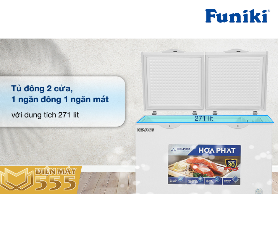 - Mẫu tủ đông Hòa Phát 271 lít này được thiết kế dạng tủ nằm, 1 ngăn đông, 1 ngăn mát và 2 cửa, có thể lắp đặt tại bất kỳ vị trí nào trong gian bếp.