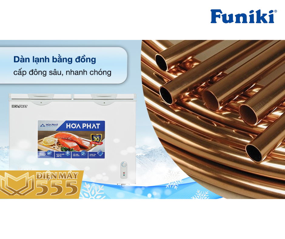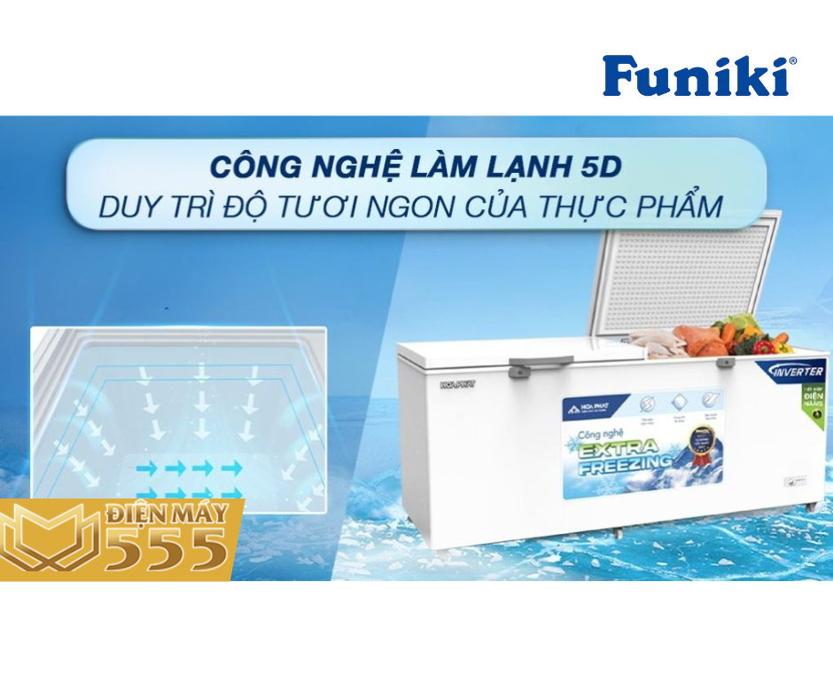 - Tủ đông Hòa Phát sử dụng cơ chế làm lạnh trực tiếp, truyền lạnh nhanh chóng đến thực phẩm mà không cần hệ thống quạt đối lưu phức tạp, giúp tiết kiệm năng lượng.