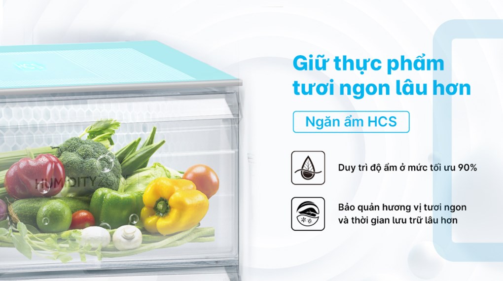 Ngăn ẩm HCS giữ cho thực phẩm được bảo quản tươi lâu hơn bằng cách duy trì độ ẩm ở mức tối ưu. Ngăn này giúp bảo quản được hương vị tự nhiên của thực phẩm và kéo dài thời gian lưu trữ.